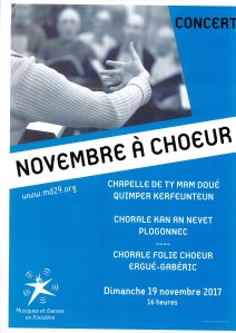Dans le cadre de l’opération « novembre à choeur », la chapelle de Ty Mamm Doué accueille les chorales « Kan An Nevet » de Plogonnec et « Folies en choeur » d’Ergué Gabéric pour une prestation à partir de 16h00
