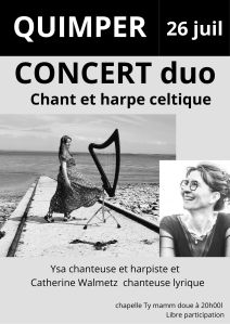 Le prochain concert à la chapelle est proposé ce vendredi 26 juillet 2024 à 20h00 pour un duo associant harpe celtique et chants.